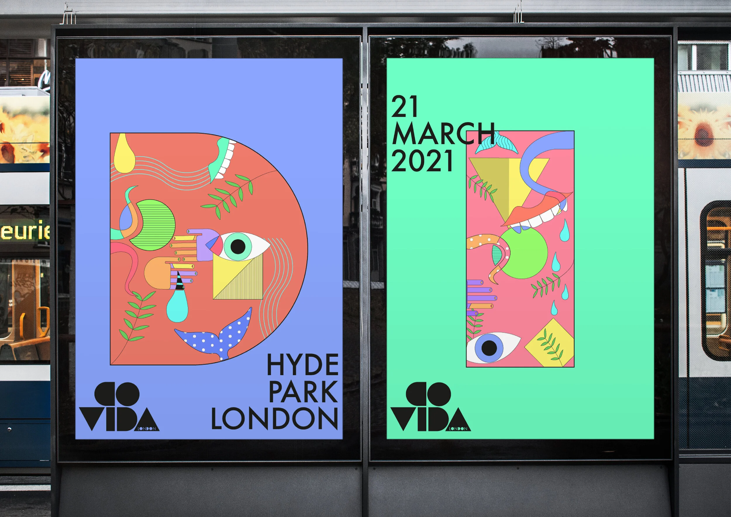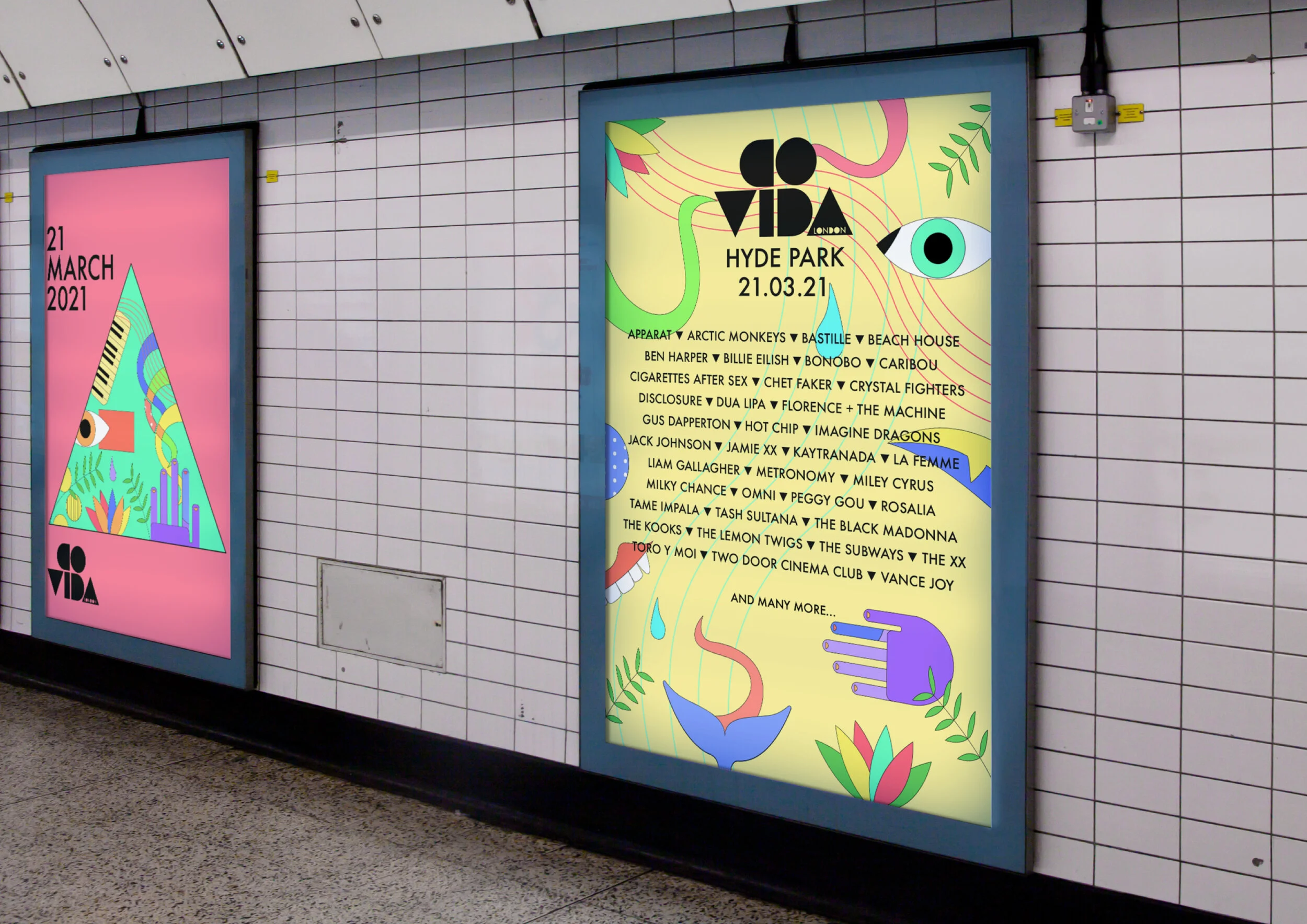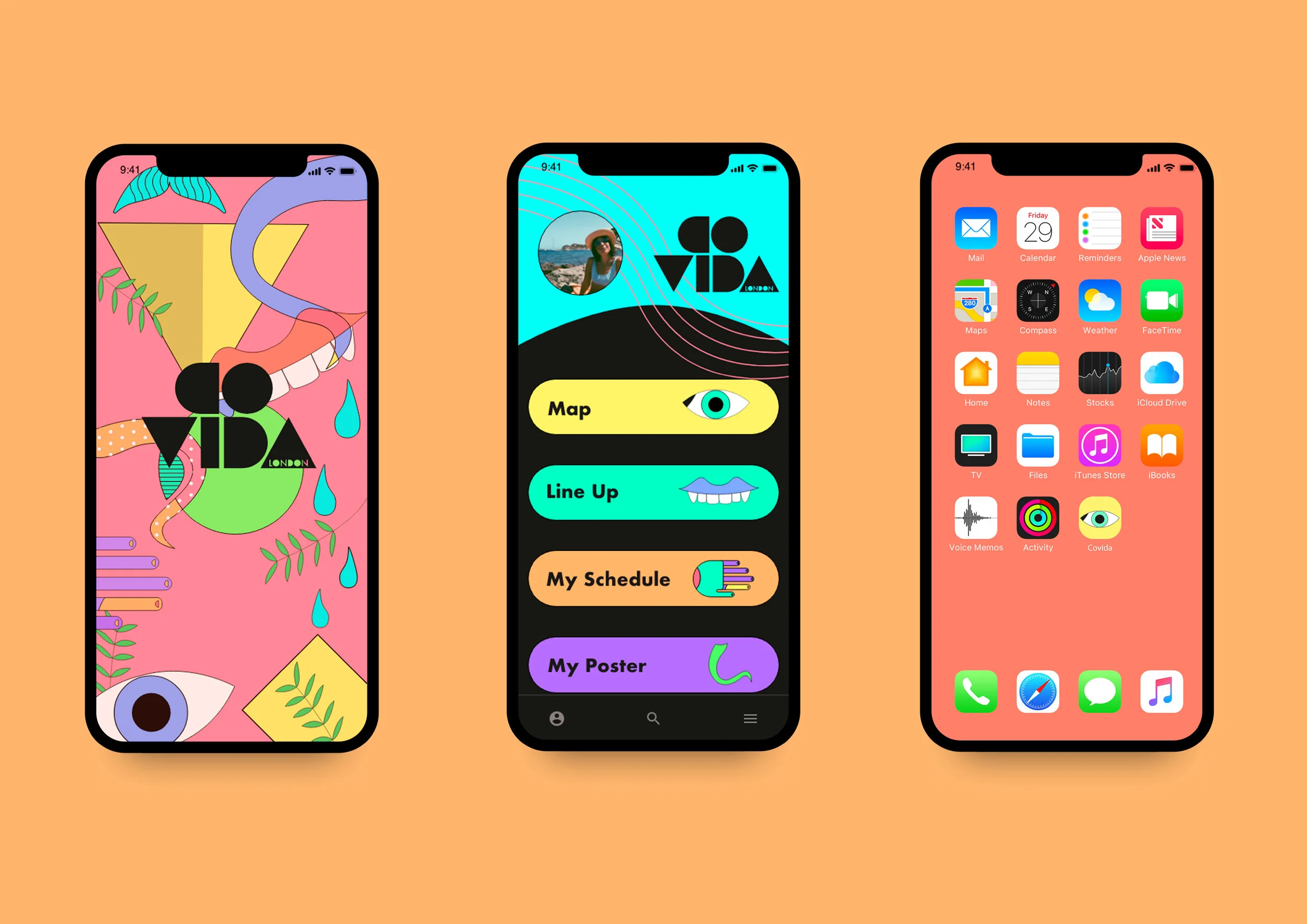 Covida is the last project I developed while finishing my Postgraduate at UAL. I created the visual identity for this hypothetical music festival defining the brand and creating the logo, colour palette, illustrations, posters, festival app and merchandising.
