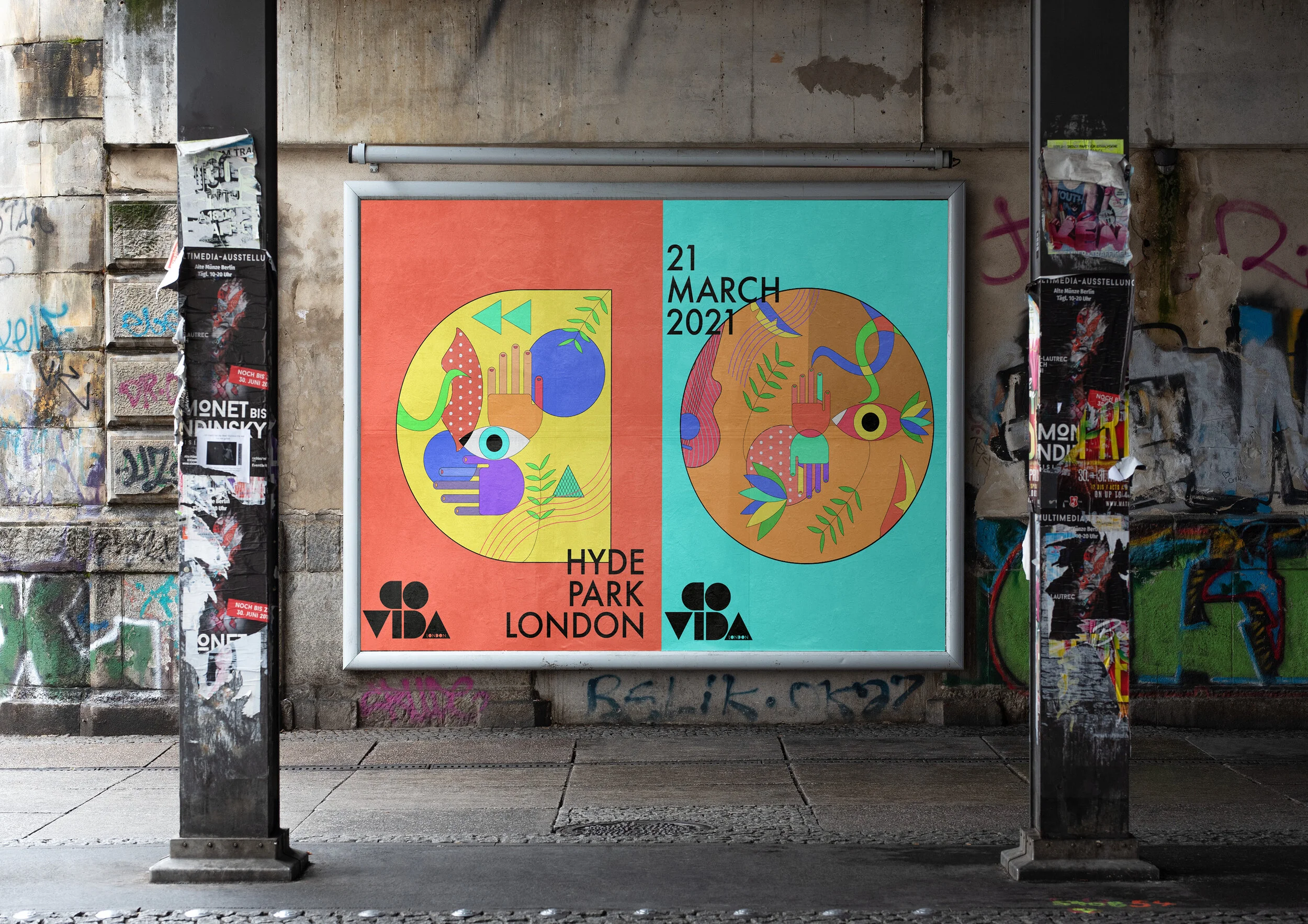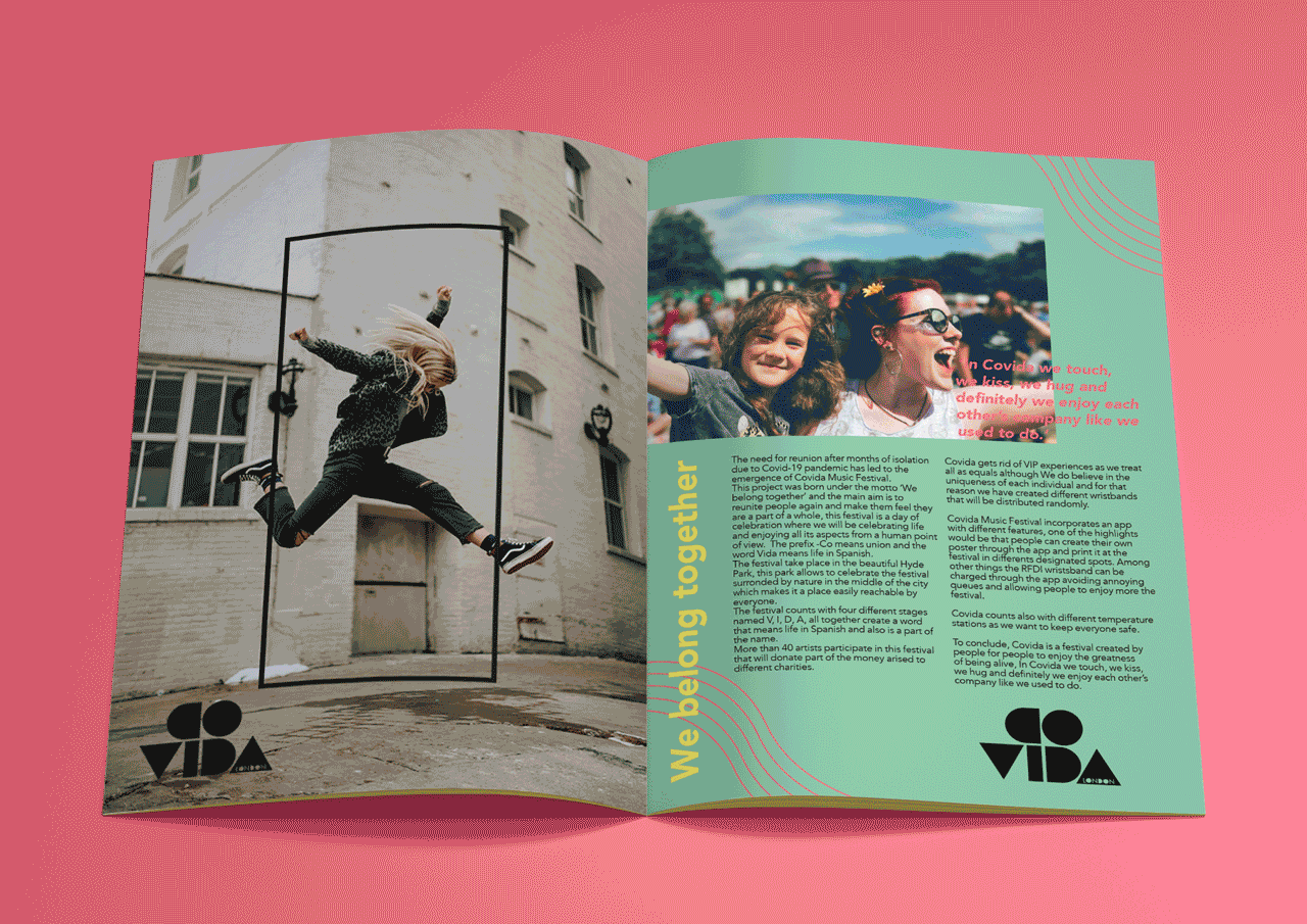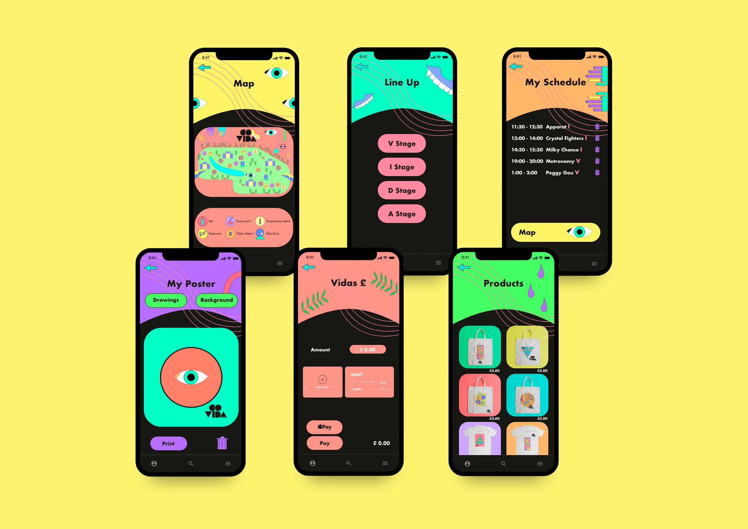 Covida is the last project I developed while finishing my Postgraduate at UAL. I created the visual identity for this hypothetical music festival defining the brand and creating the logo, colour palette, illustrations, posters, festival app and merchandising.
